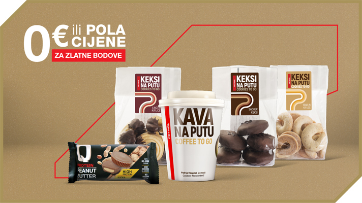 Zaustavite se na Petrolu i okrijepite se s kavom Na putu ili nekim drugim toplim napitkom po vašem izboru. Uz to si priuštite nešto slatko – keks Na putu ili Protein Q Cup! Kekse, tople napitke Na putu i Protein Q Cup možete u našoj ponudi nabaviti za 200 Zlatnih bodova za 0 €. Protein Q Cup također možete dobiti u pola cijene, zamjenom za 100 Zlatnih bodova.