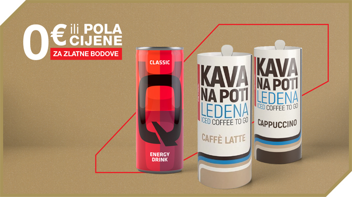 Ledena kava Na putu ili energetski napitak Q Energy Drink. Odaberite svoje Petrol piće i u zamjenu za Zlatne bodove osvježite se uz 50 % popusta ili čak za 0 €.